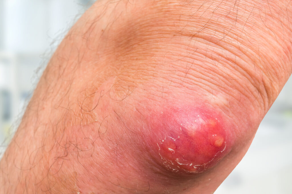 A boil is a skin infection that begins in a hair follicle or oil gland, often through a germ that enters through a small nick or cut in the skin. They most commonly appear on the face, neck, shoulders, armpits, and buttocks.