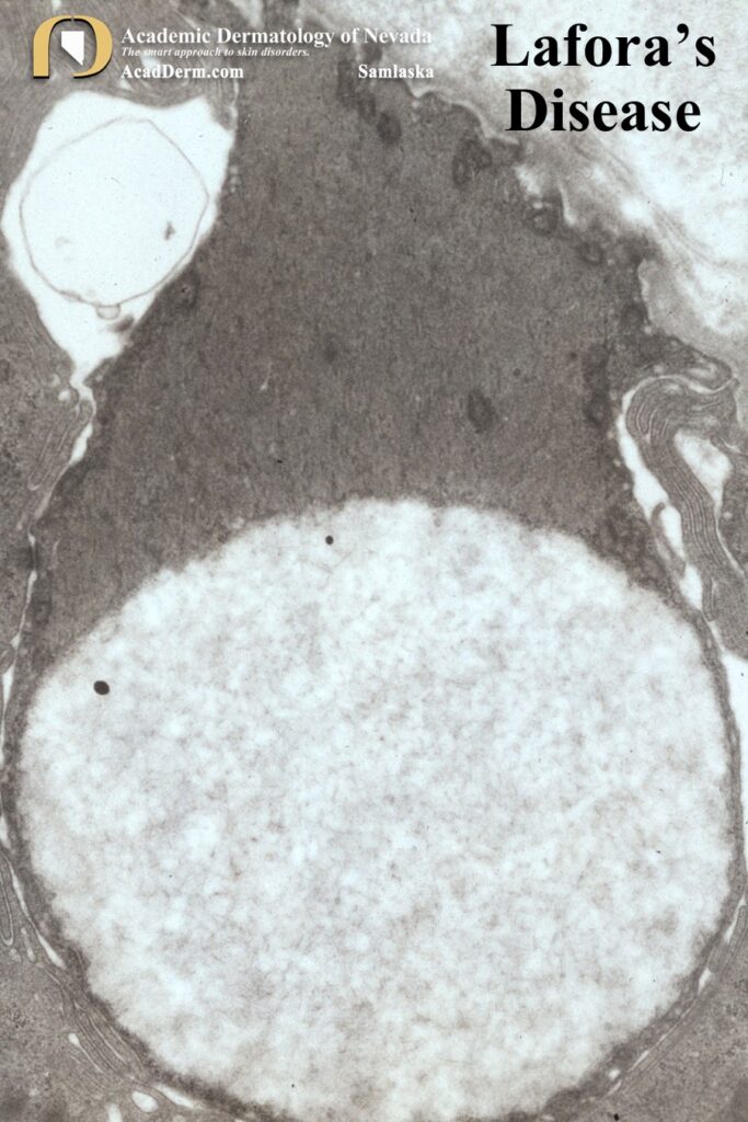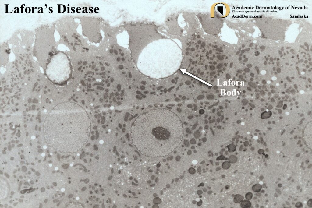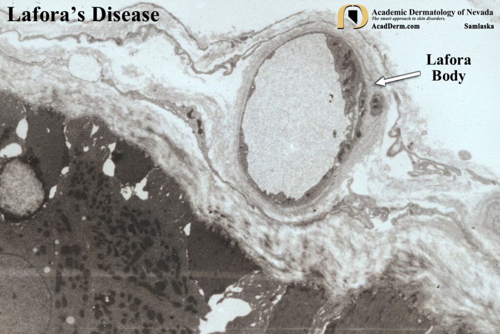 A biopsy premortem may be obtained from brain, muscle, liver or skin. Carpenter and Karpati were the first to note PAS-positive inclusions in eccrine sweat ducts and subsequent studies had confirmed that random skin biopsies to confirm the diagnosis of Lafora’s disease was a good and less invasive option for confirmation. The diagnosis is established on demonstration of characteristic cytoplasmic inclusions, called Lafora bodies, in the brain, striated muscle, liver or skin. Despite the absence of cutaneous findings, typical periodic acid-Schiff (PAS)-positive inclusions in skin biopsy specimens are present in eccrine ducts, axillary apocrine myoepithelial cells, and peripheral nerves. We published this case to suggest that the axilla should be the site of choice for random cutaneous biopsy to exclude Lafora’s disease because of the presence of both eccrine and apocrine structures in high concentration. Two axillary biopsy specimens in our patient confirmed the diagnosis. To access this article click HERE. Another reference, click HERE.