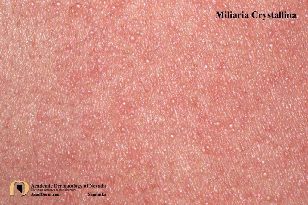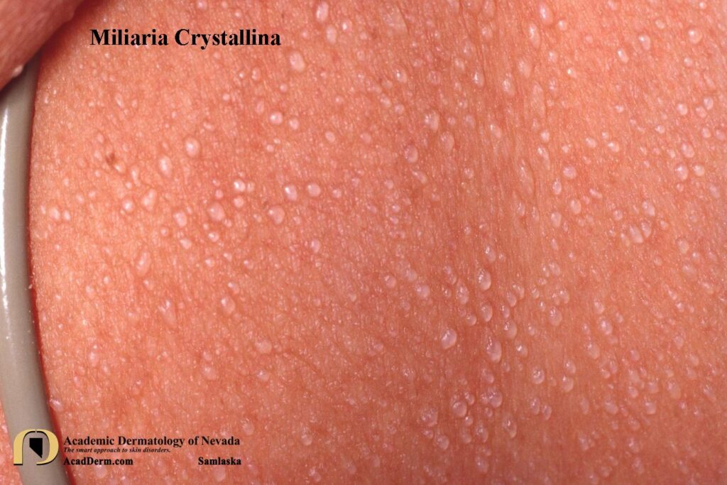 Miliaria Crystallina is also known as Sudamina. Miliaria is a common skin disease caused by blockage and/or inflammation of eccrine sweat ducts. Miliaria Crystallina more specifically is due to obstruction of the sweat ducts close to the surface of the skin in the stratum corneum of the epidermis. The lesions are characterized by small, clear, superficial vesicles with no inflammatory reaction.