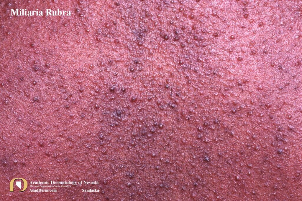 TREATMENT: No treatment is necessary. Management of environmental exposure is effective, such as air-conditioning, avoid excessive or tight clothing, avoid excessive soap use and removing wet clothing. Some authors have recommended cool water compresses, emollients, topical steroids and use of antiseptics and anti-staphylococcal antibiotics to avoid secondary infections. To read more about Miliaria Rubra click HERE and HERE.