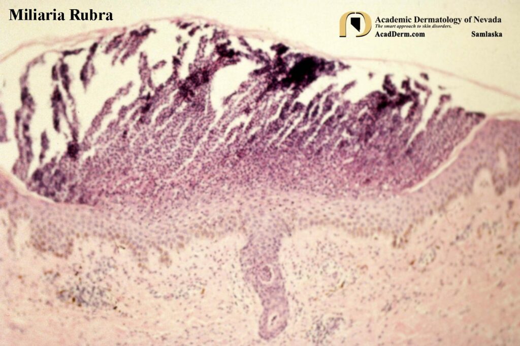 Miliaria Rubra is also known as Heat Rash and Prickly Heat. It is the most common form of miliaria and is seen in children and up to 30% of adults who move to a tropical environment or are exposed to sudden changes in heat and humidity. It often takes several months to peak after the initial exposure. Miliaria Rubra is due to obstruction of the sweat ducts close to the surface and extends into the mid-epidermis as shown below…