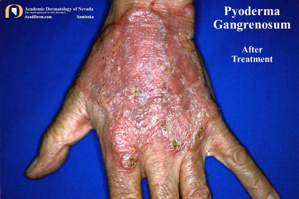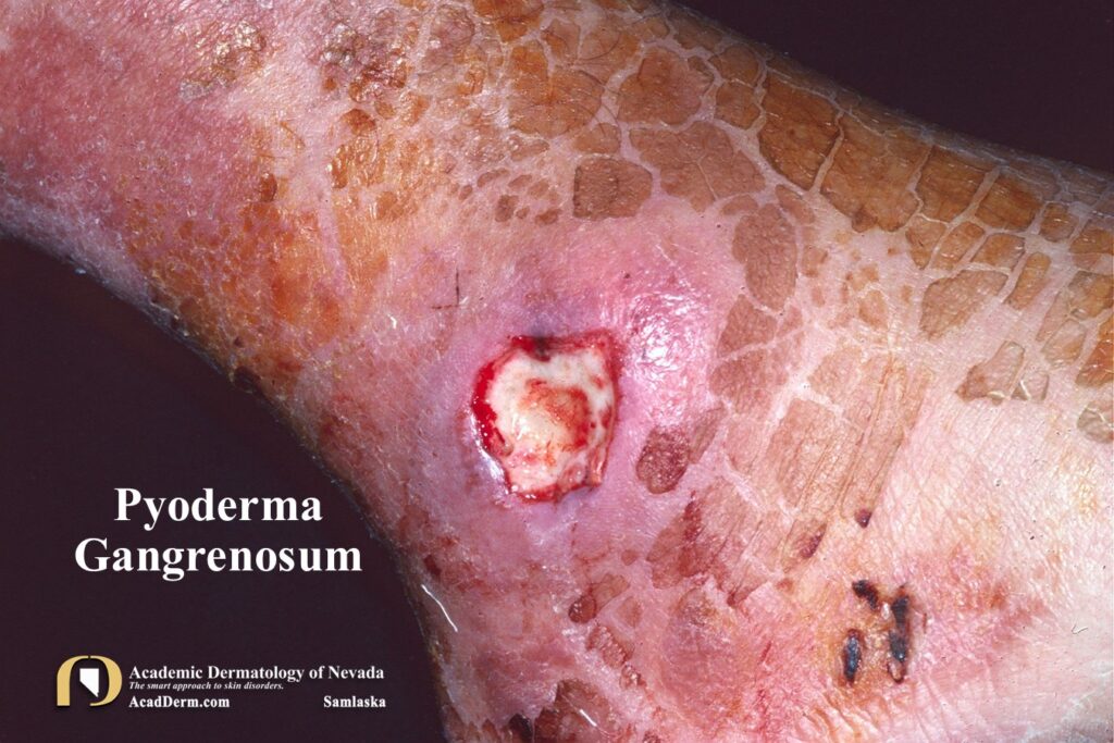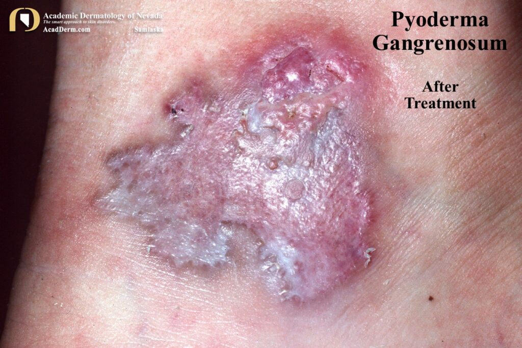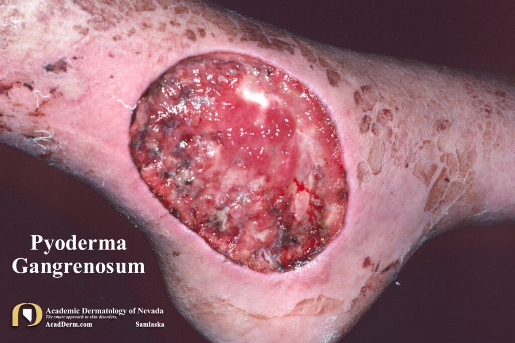 Overall over 50% of patients with PG have an associated disease, such as IBD (Crohn’s or Ulcerative Colitis), leukemia, myeloma, monoclonal gammopathy, polycythemia vera, myeloid metaplasia, chronic active hepatitis, hepatitis C, human immunodeficiency virus (HIV), systemic lupus erythematosus, pregnancy, PAPA syndrome and Takayasu arteritis.  It frequently is misdiagnosed as an infectious disease or a spider bite.  Factitial disease may also be very difficult to exclude clinically.