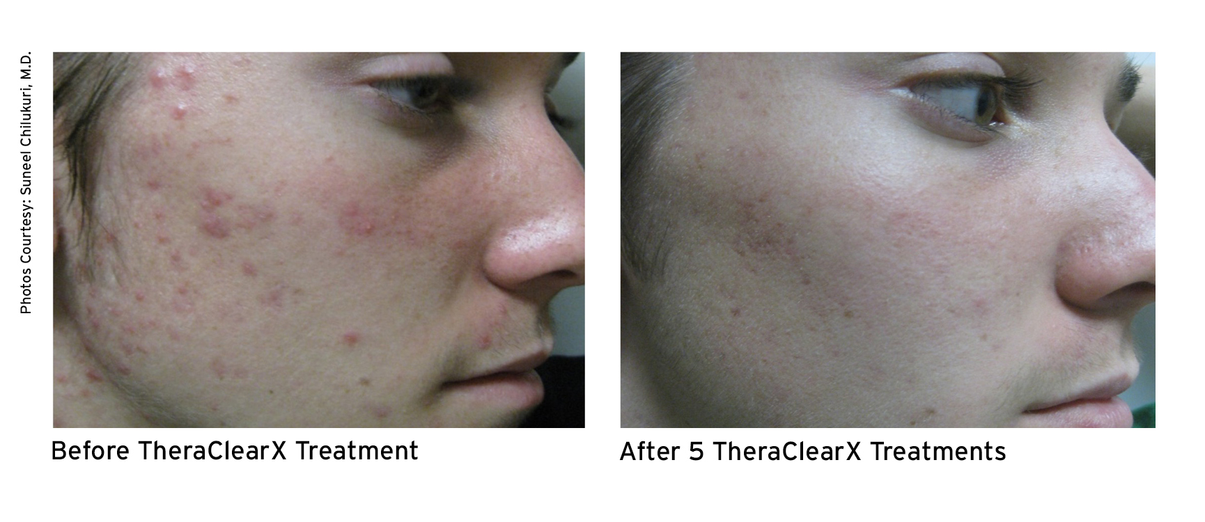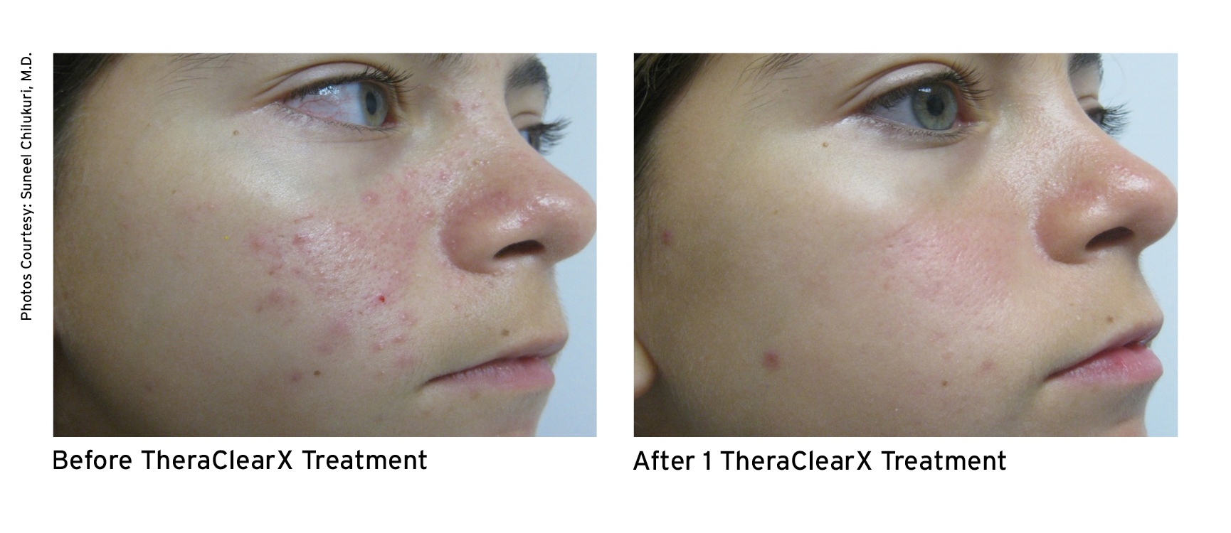 TheraClearX is a noninvasive, in-office acne treatment system. It is engineered and FDA-cleared for the treatment of mild-to-moderate acne, including comedonal, pustular, and inflammatory acne vulgaris. TheraClearX combines vacuum + broadband light technology that is delivered through a liquid-cooled, handheld delivery system.